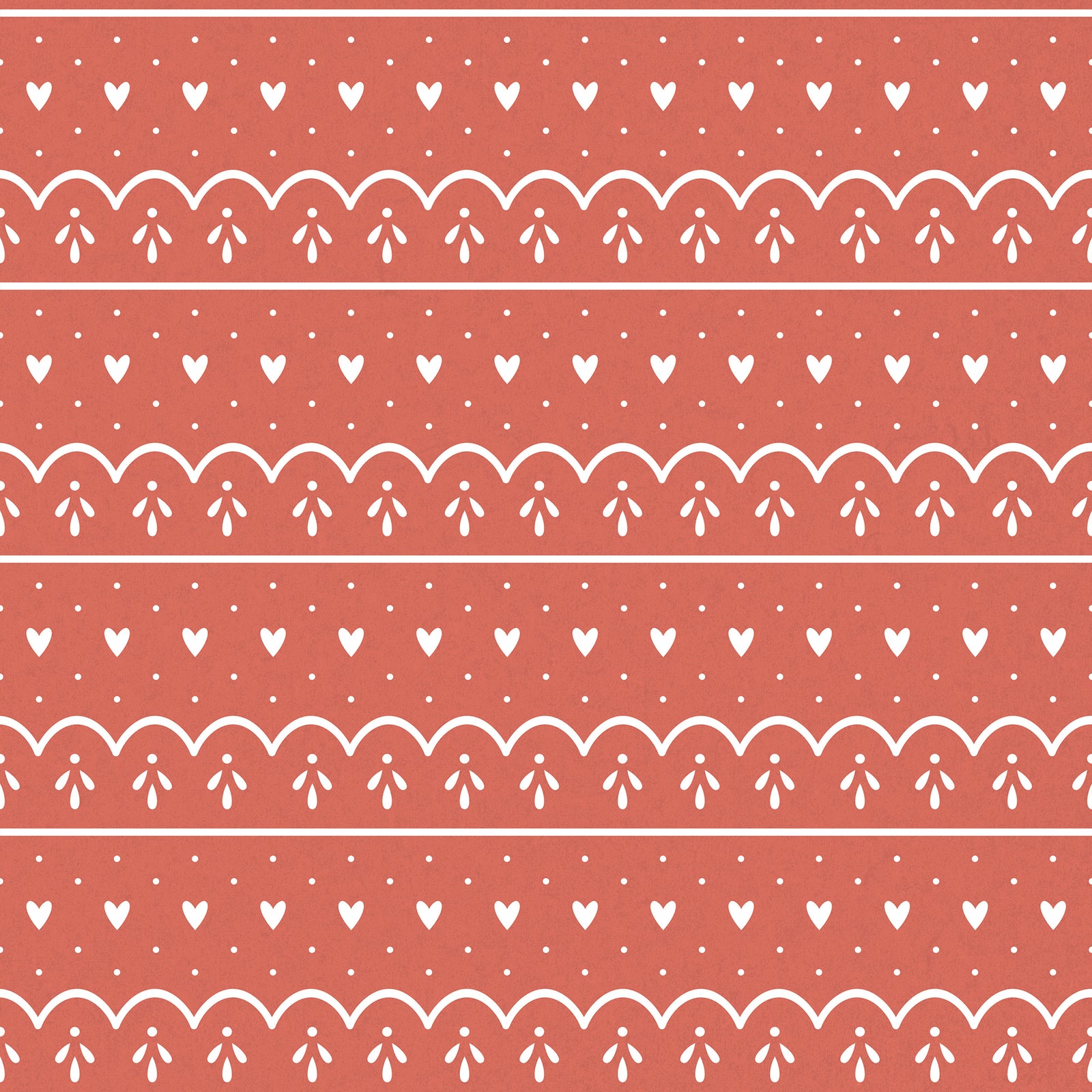 Red wrapping paper with white hearts, dots and scallops