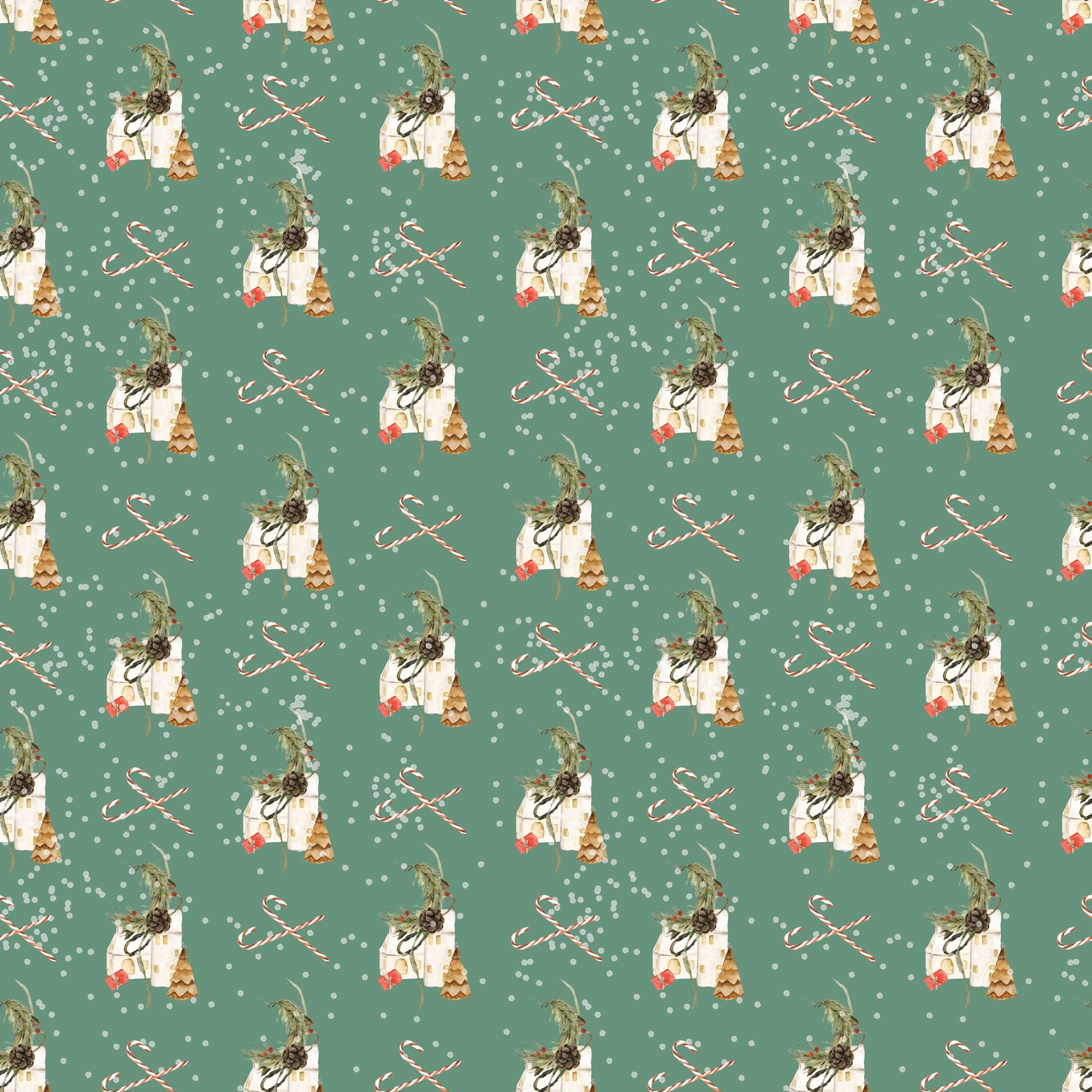 Green Christmas wrapping paper with white houses, pine tree branches and cones with white dots and candy canes in the background