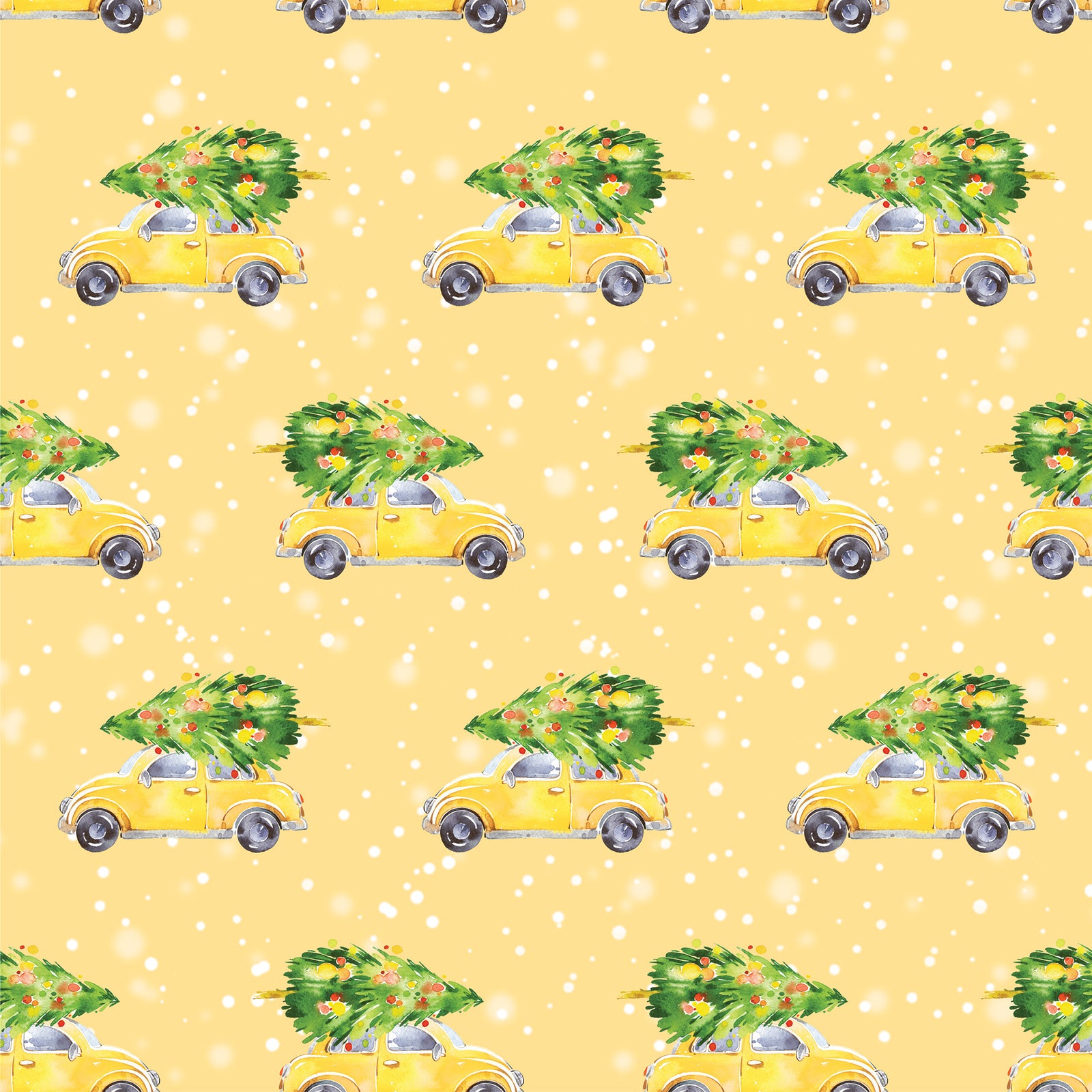 Yellow Chirstmas wrapping paper with yellow cars with Christmas trees on top of them