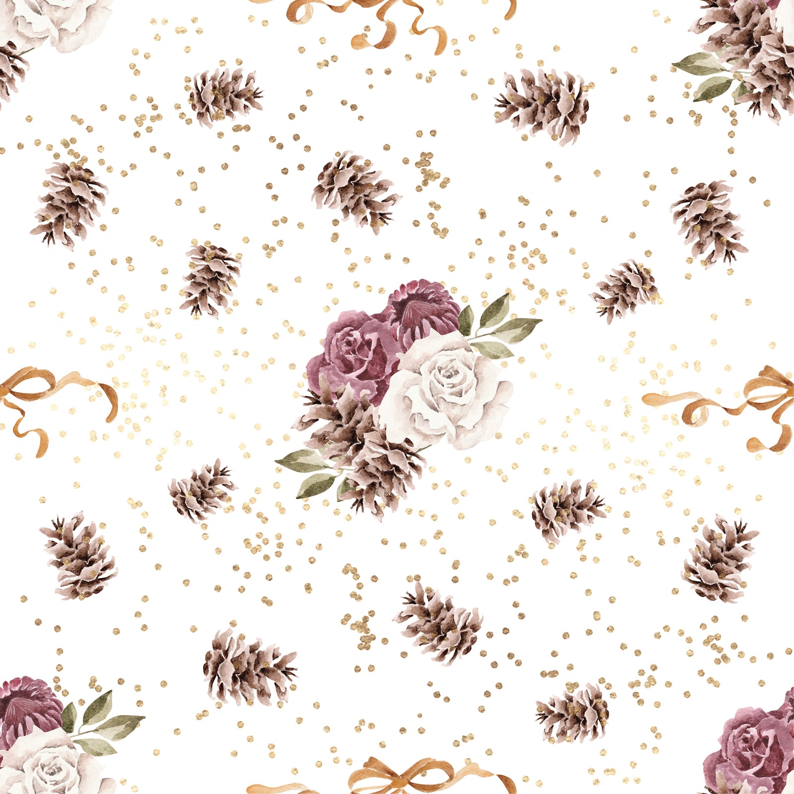 White wrapping paper with roses, pine cones and golden bows