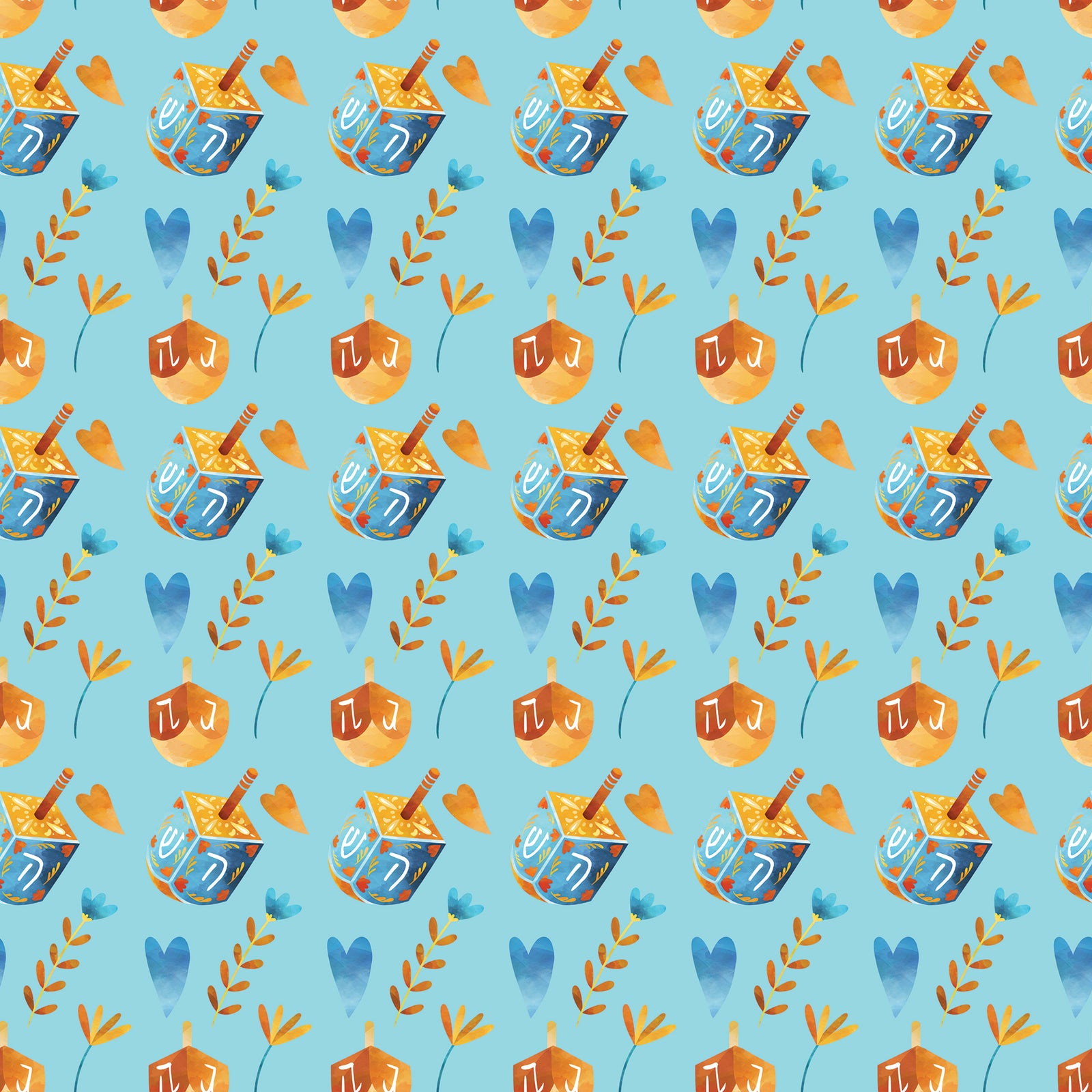 Blue wrapping paper with Stars of David in blue and yellow, branches, orange and blue Dreidels and yellow Menorahs